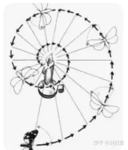 昆虫到光源:它们习惯于将光源与飞行路径保持恒定角度。通常,太阳(或夜间物种的月亮)是唯一的光源,以这种方式飞行将导致几乎直线。 但是人造光源离得太近,虽然它们夹角恒定,但是会导致越飞越近造成飞蛾扑火的现象。